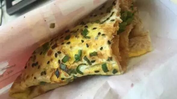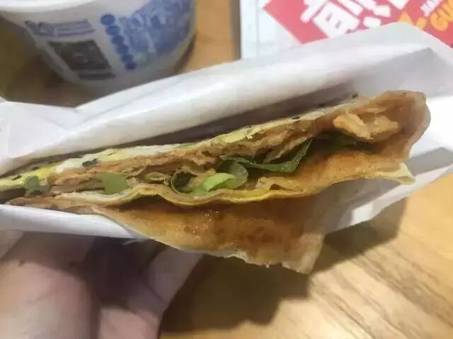 马记的鸡蛋灌饼表皮金黄酥脆,饼里面的鸡蛋也是香的够味,撒上少许葱花,加上干净的生菜,只看着就很有食欲。
