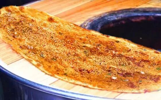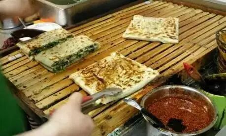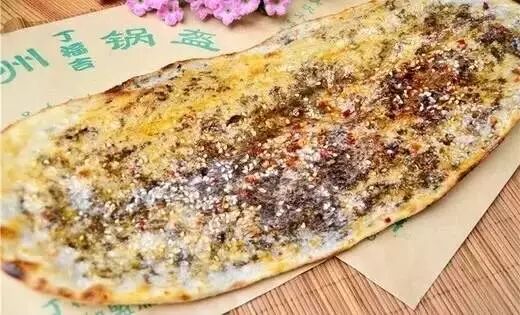 椭圆形状的锅盔长度大概有30厘米多,出炉涂上色泽鲜亮的辣椒油,折成两半装进纸袋,趁热吃,焦脆浓香。