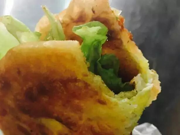刚出锅的菜煎饼,焦香酥软,香味四溢。整体来讲是家常味道,口感劲道而不松散。