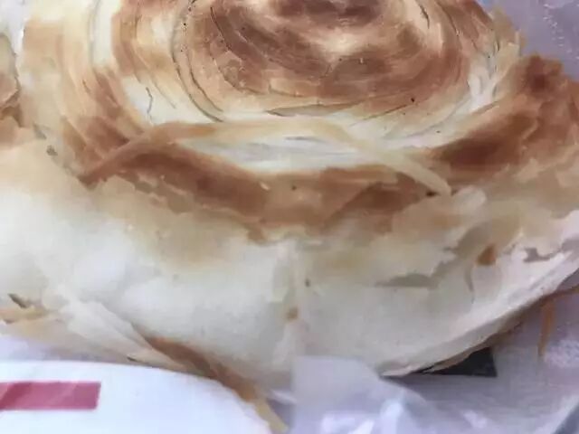 饼的外皮酥脆掉渣,店员介绍,饼的制作方法是精制面粉加碱面、温水、油和成面团、搓成条、卷成饼放入特制烤炉,所以出炉的烧饼有着一层层酥脆的裹边。