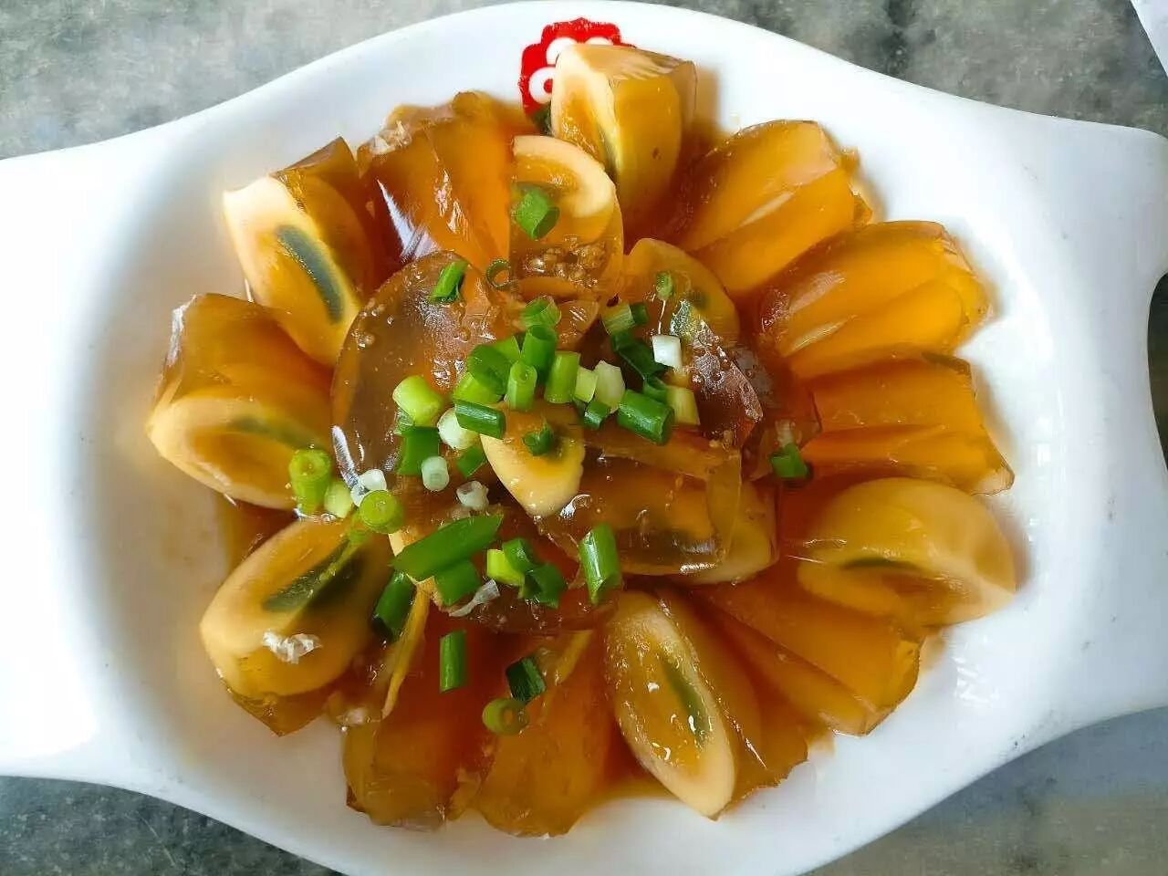 变蛋有别于皮蛋,前者用鸡蛋后者用鸭蛋,但做法大同小异,吃起来口感味道很冲,不愧被外国人称为黑色料理,好在变蛋颜色晶莹剔透,能让食客食欲有所增加,但就价格和口感来说,不推荐。