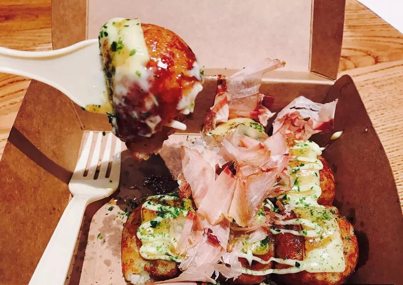 日式章鱼小丸子一盒有6颗,新鲜出炉的小丸子粒粒都呈现金黄色,淋上照烧酱和海苔丝和松软的柴鱼片,这盒章鱼小丸子瞬间有了生命。