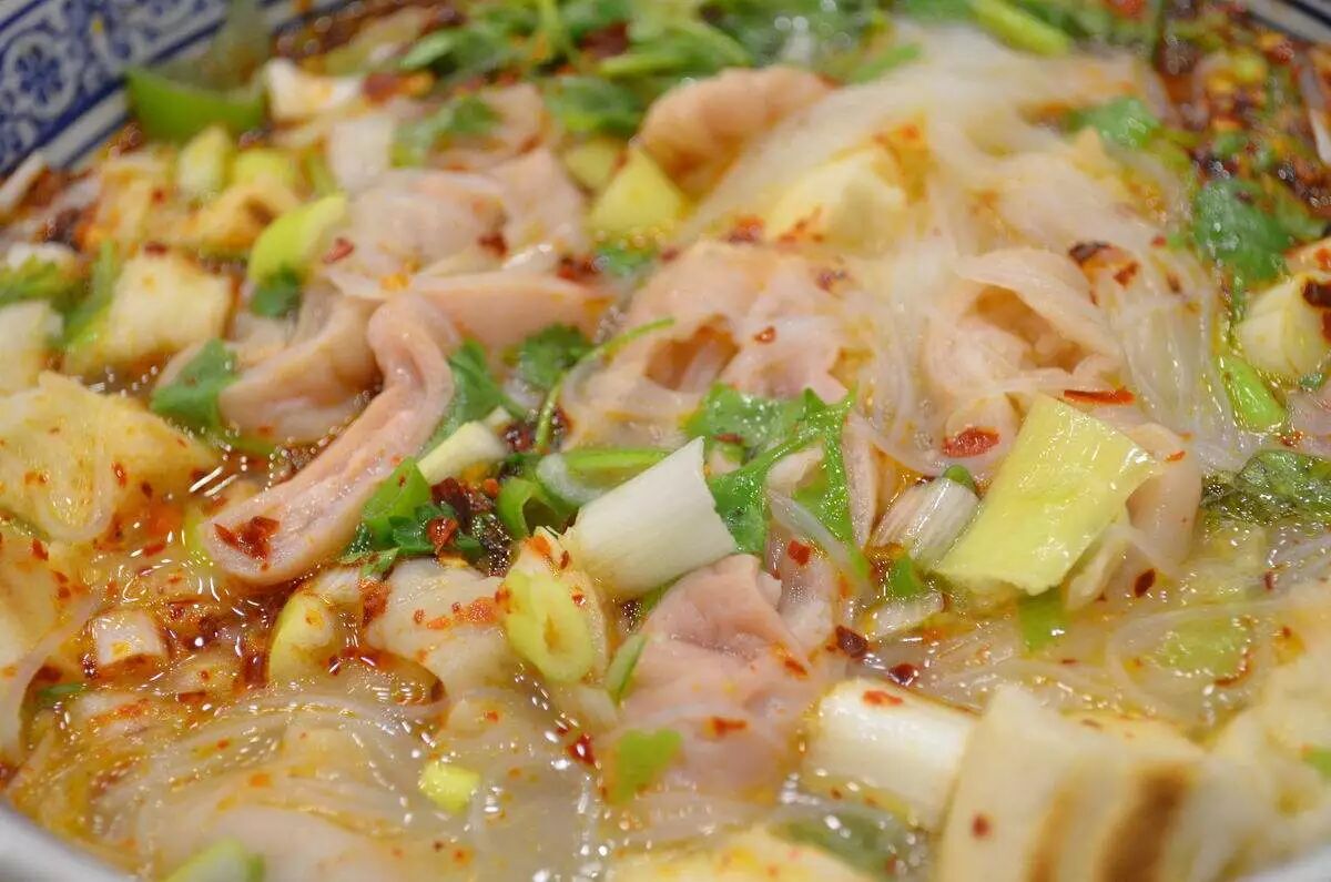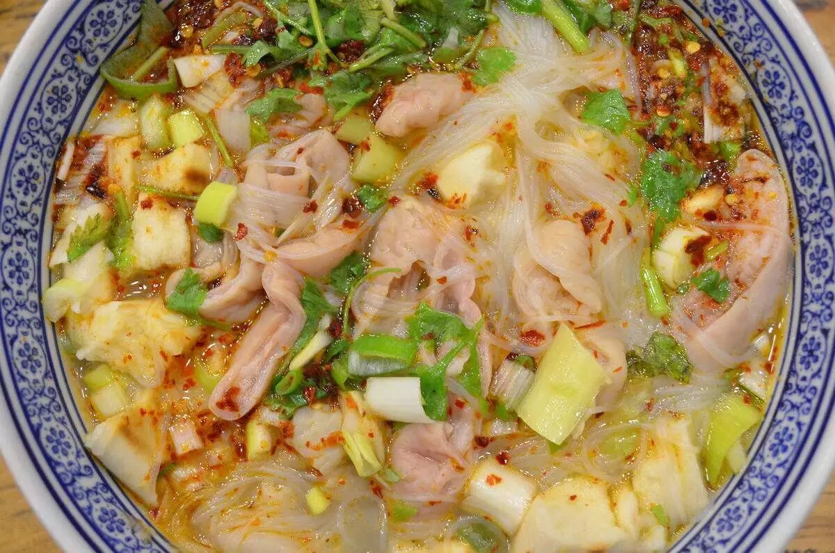 (3)馍:在大铁锅内倒入原汁汤约18千克,对水9千克,旺火烧开。吃时将馍掰成碎馍块,放入大碗中(一般每碗200克),然后将熟大肠、熟肚子各切成三片八分长的坡刀片;熟猪肉切成两片一寸半长、二分厚的肉片;鸡肉切成两片一寸半长、四分宽的片。然后,把它们整齐的排放在掰好的馍上,用锅内滚开的汤汁反复浇3-4次,使碗内的馍块浸透汤汁。然后放入料酒、调料水、味精、香菜末、蒜苗丝,淋上熟猪油(15克),再浇入适量的滚汤汁即可食用。