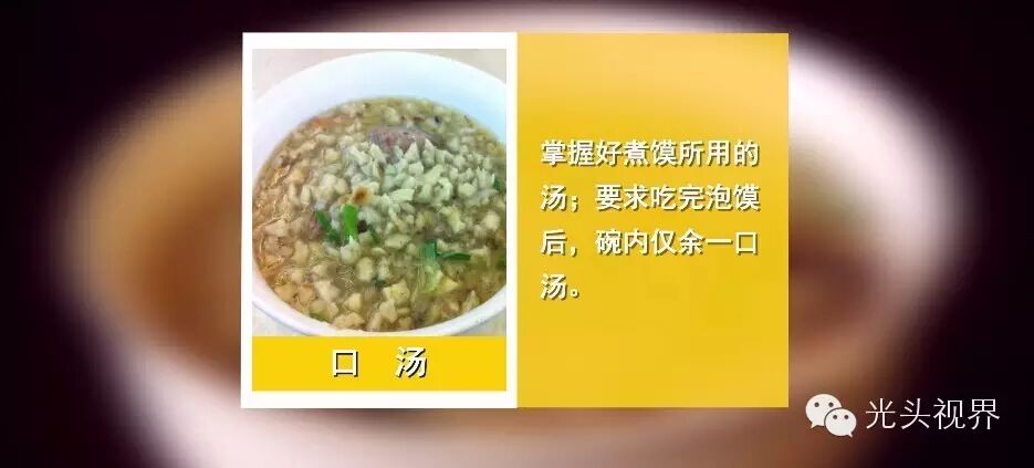 掰馍一共分为四个步骤:一掰,将馍分成四等分;二撕,从中间将馍撕成两片;三掐,用指尖将馍掐成黄豆粒大小;四抖,抖的时候检查一下是否有遗漏的大粒馍块。