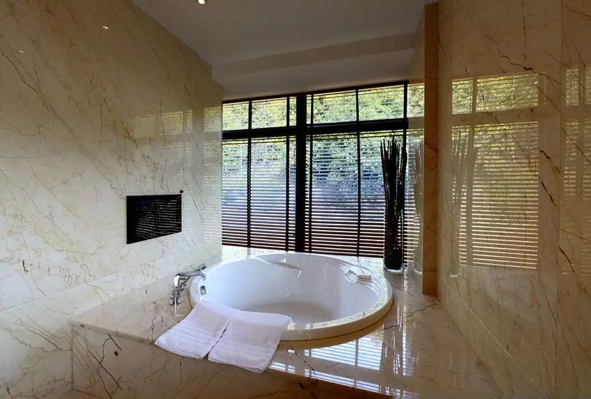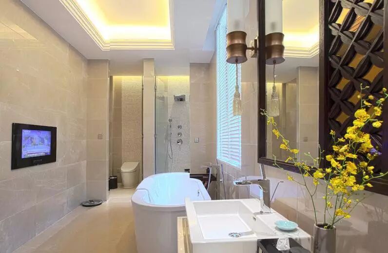 超大的洗卫空间,配有Spa台,百叶窗外是微澜的湖光,兴致起做个操练个瑜伽绰绰有余;自动马桶,热带雨林淋浴房,洗浴用品已备好欧舒丹全套;泡在大浴缸里,看看电视或俏皮扑腾几下,如鱼得水般自由自在。