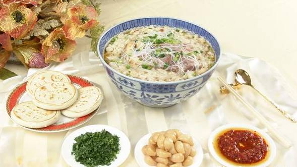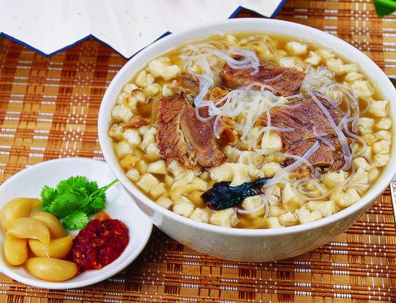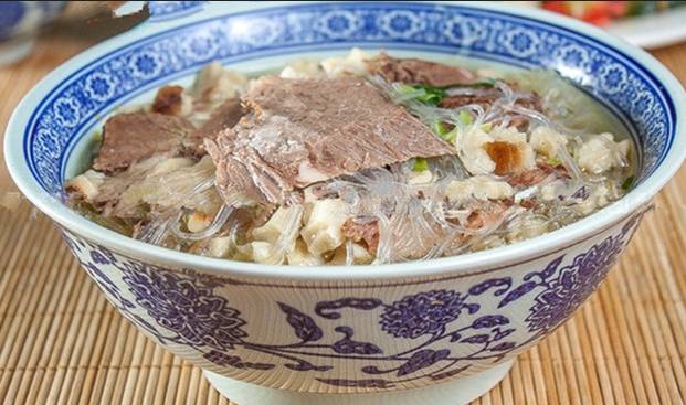 牛羊肉泡馍原名羊肉泡馍,古称"羊羹",宋代著名诗人苏轼有"陇馔有熊腊,秦烹唯羊羹"的诗句。羊肉泡馍的烹饪技术要求很严,煮肉的工艺也特别讲究。其制作方法是:先将优质的羊肉洗切干净,煮时加葱、姜、花椒、八角、茴香、桂皮等佐料煮烂,汤汁备用。馍,是一种白面烤饼,烤饼的面必须是死面,吃时将其掰碎成黄豆般大小放入碗内,然后叫厨师在碗里放一定量的熟肉、原汤,并配以葱末、香菜、黄花菜、黑木耳、料酒、粉丝、盐、味精等调料,