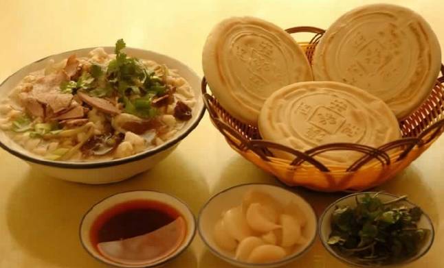 单勺制作而成。羊肉泡馍的吃法也很独特,有羊肉烩汤(水盆羊肉),即顾客自吃自泡:也有干泡的,即将汤汁完全渗入馍内。吃完馍、肉,碗里的汤也被喝完了。还有一种吃法叫"水围城",即宽汤大煮,把煮熟的馍、肉放在碗中心,四周围以汤汁。这样清汤味鲜,肉烂且香,馍韧入味。如果再添以辣酱、糖蒜,别有一番风味。是一种难得的高级滋补佳品。西安的羊肉泡馍馆很多,其中老字号有"老孙家"、"同盛祥"等较有名气。