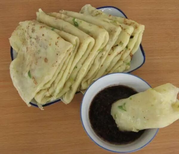 咸食的做法也很简单,几分钟也就可以出锅,将面粉、鸡蛋调成糊,里面放些葱花儿,加上适量的盐,平底锅(鏊子)刷些油,倒进面糊儿以后,用刮子不停地往前赶,直到将面糊儿摊成规则或不规则的圆形,有一韭菜叶厚薄,温火,片刻,一张焦黄,酥软的咸食做成了,再小心的用铲刀揭下来,沾上一碗醋、香油、蒜末调出来的汁一起吃,实在是美味至极,顺着嗓子眼儿滑过,舌头般的柔软,入口即化。