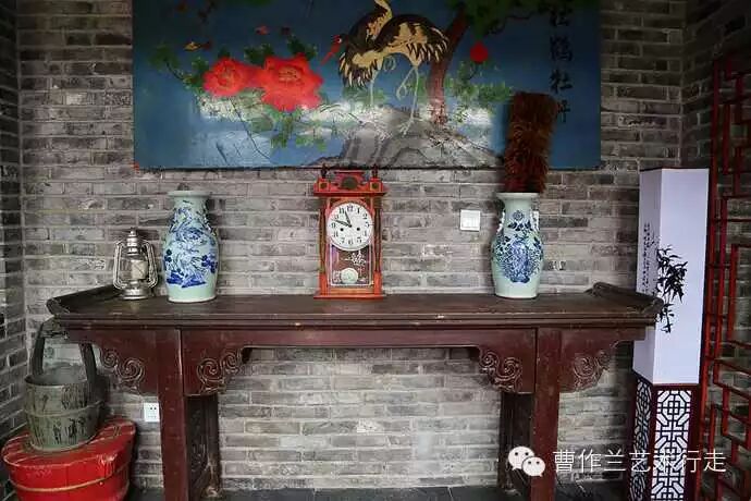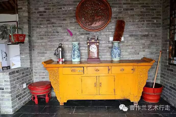 一进门的堂屋有这样的旧物件,很是亮眼。黄色的叫“联三”,有三个抽屉相链接。联三上面有掸瓶和老座钟。