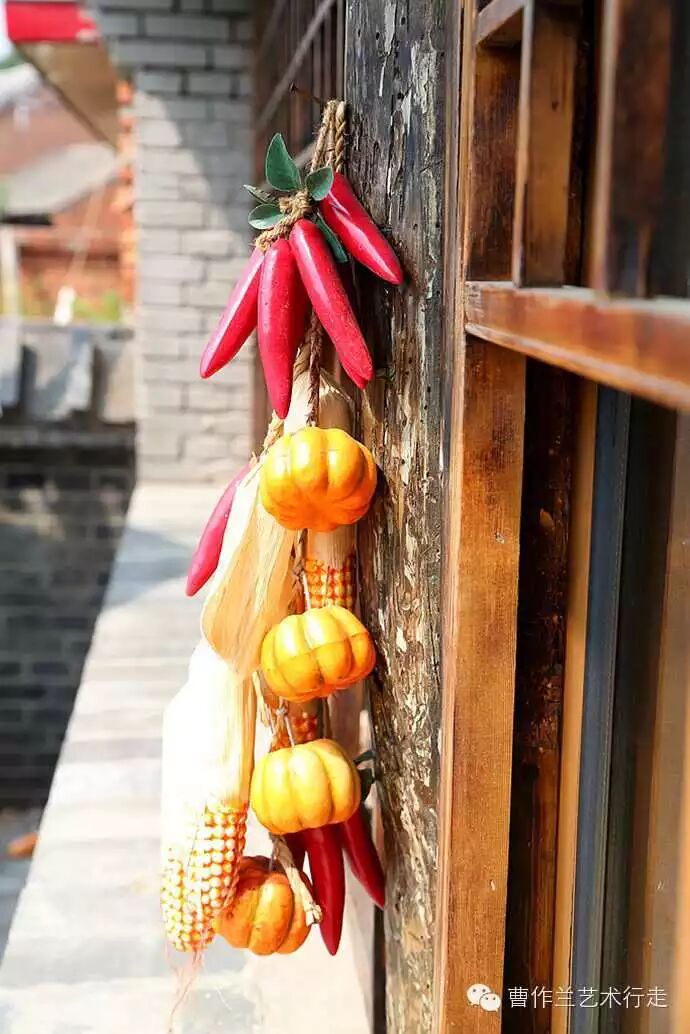 室外老木柱子上悬挂着农产品装饰物。