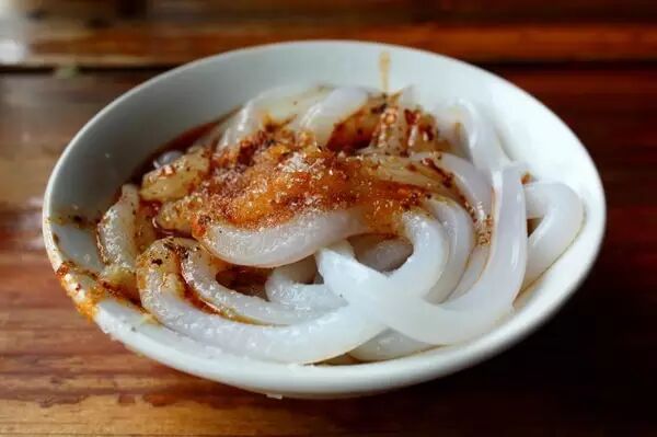 下面这个是伤心凉粉。滑滑的凉粉拌了辣油糖醋,还加了新鲜的小米辣,一遍滴汗一遍还要再来一碗!