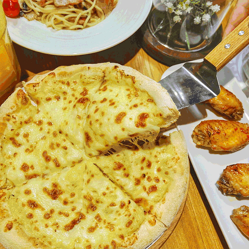 新战点,一家卖了3000000万块的榴莲披萨店,自带神秘小花园,招牌是榴莲披萨和照烧鸡肉披萨,兼带各种西式小食!他家的披萨饼底很薄而且有劲道,据说这是因为饼底纯手工制作而成,而且面团采取了冷发酵的技术。