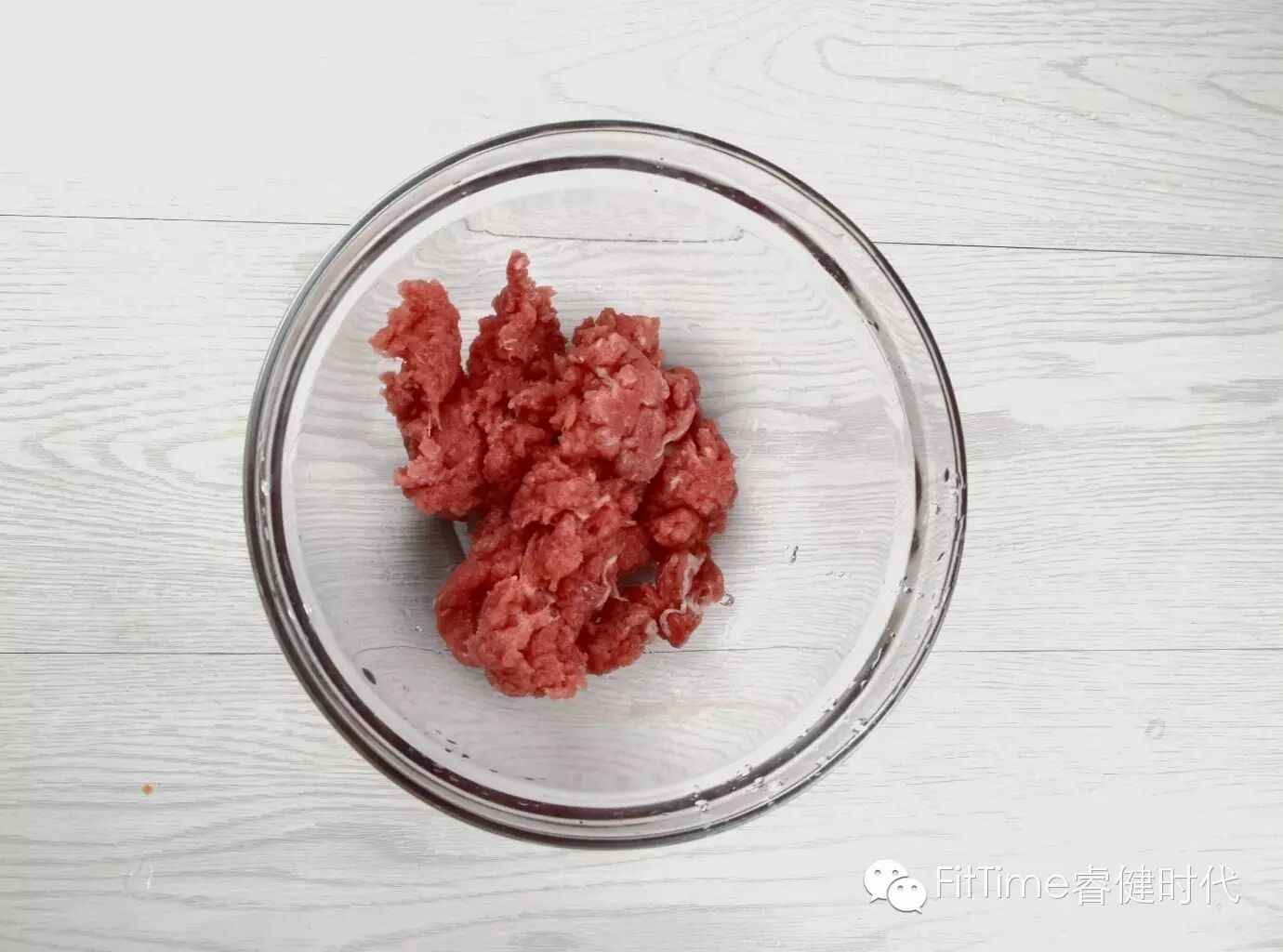 2.取一个玻璃碗依次放入牛肉泥等食材;