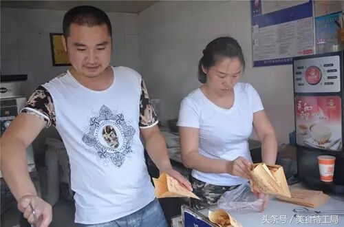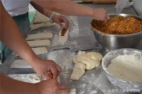 夫妻两人相互配合相互帮忙。把馅料分层放入面团里面,再缠绕一下,一个锅盔就包出来了。