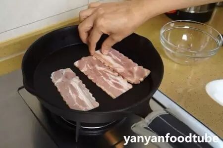 1. 将培根煎至金黄色切碎备用,洋葱炸制金黄色控油备用。