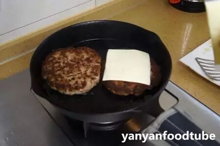 2.牛肉饼用中小火煎制,放上芝士后盖上盖子芝士更容易融化。