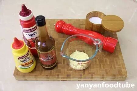 番茄酱1汤勺tbsp / 伍斯特酱油2茶勺tsp / 黄芥酱1汤勺tbsp