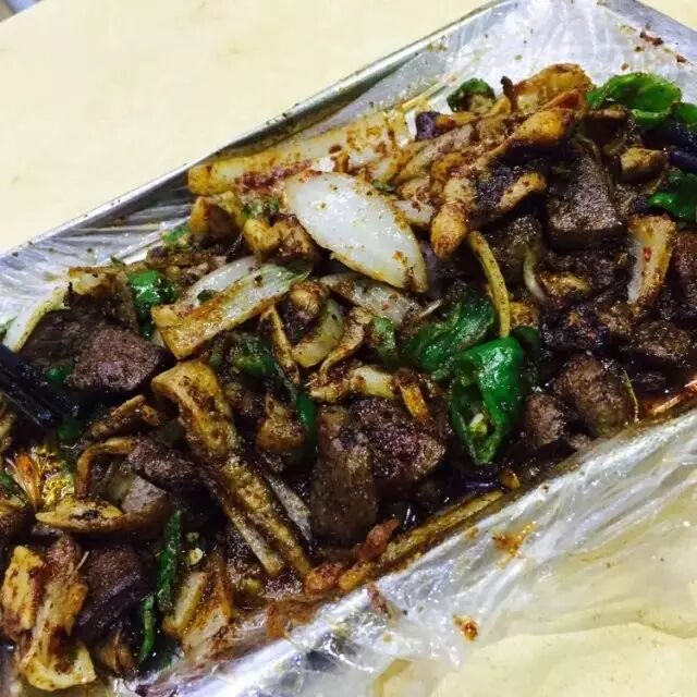 将羊肝、肺、肚、肠、心等佐以调料葱花蒜苗下锅爆炒