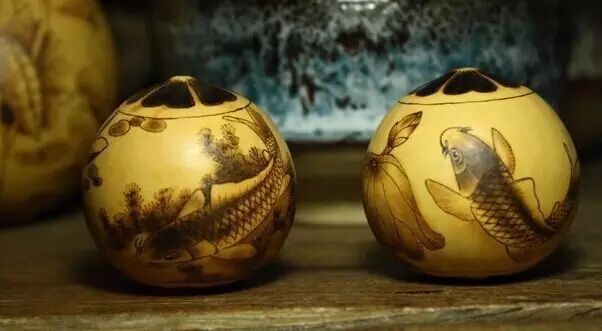 注:烙画葫芦要用用一年以上上色的葫芦,就是为了画完以后不用在日晒上色了。其次在室内摆放经常用手或棉布擦拭把玩让葫芦上浆,包浆以后烙痕将不会褪色了。再有就是在不摆放的时候放在纸盒里防潮,防化学侵蚀,防磕碰,防蛀虫。