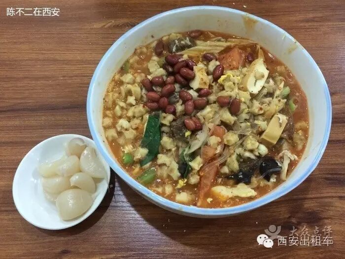 点评:照旧把馍掰碎,一碟糖蒜旁边伺候着,等馍一端上来,我还是比较期待的,红红的闻着是带点酸的,尝一口是酸辣味道的,比泡馍清爽一点,但看着很有食欲,总体还行吧,我个人觉得比泡馍好吃。有一点得说,他家的糖蒜秒杀到了我,好吃~