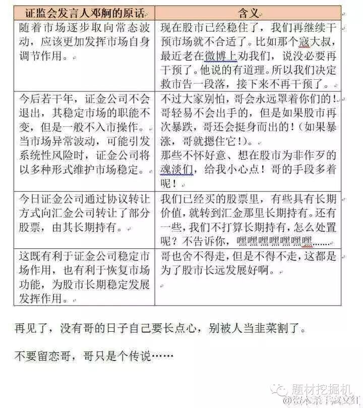 继续解读,前期证金买股积极维稳,现在市场不上窜下跳了,恢复正常了,证金的使命也就完成了。注意,“不会退出”的提法应这样理解:今后若干年,证金始终是市场的守护神,虎视眈眈,但不会轻易出手干预,除非股市再发生类似前期的剧烈波动和系统性风险。而不是有些媒体断章取义的发挥为今后若干年一股不卖,把手中股票封存!
