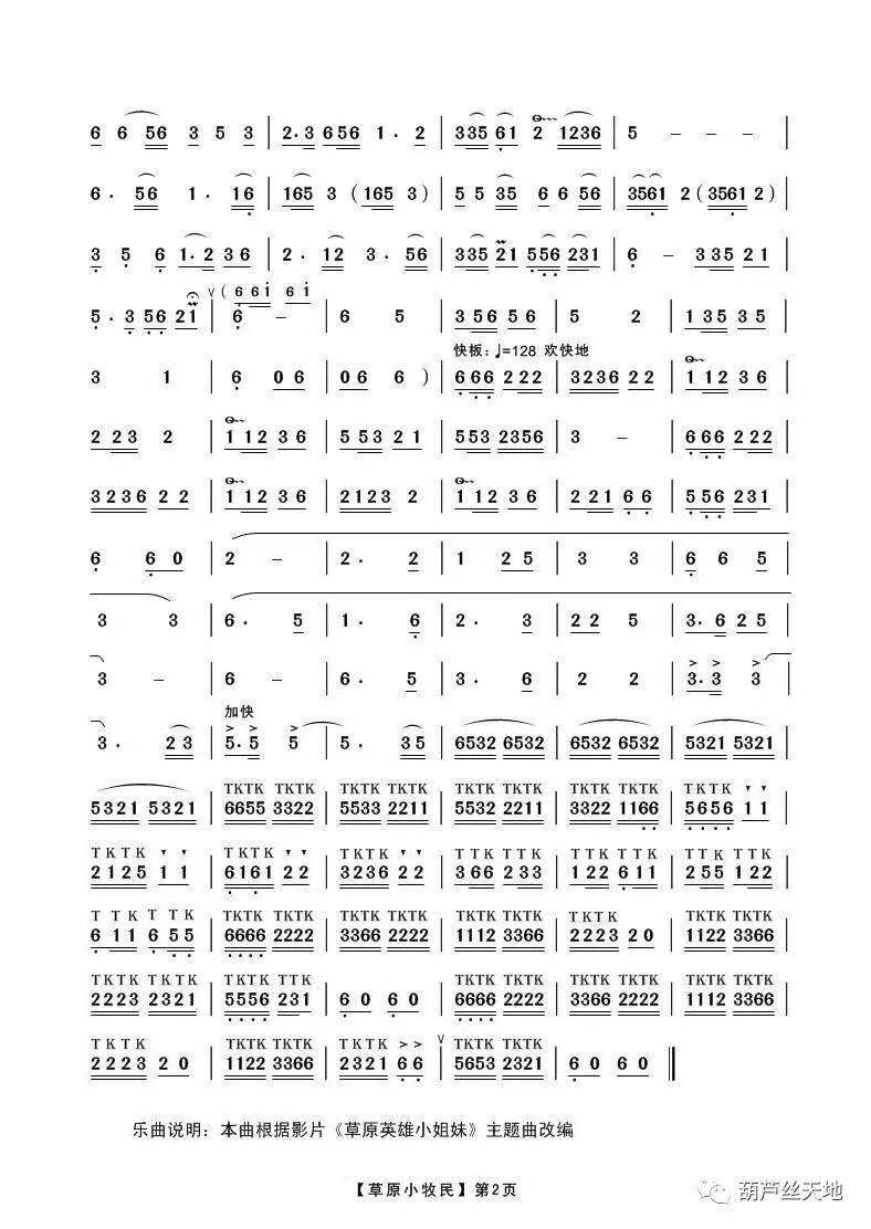 乐曲根据四十年前的一部动画影片《草原英雄小姐妹》中的主题曲改编的。剧情描写一对十岁左右的草原姐妹为保护集体羊群,不顾个人安危与暴风雪作斗争的故事。乐曲采用草原风格、民族调性6音为主音的羽调,曲式是回旋式三部曲,降B调葫芦丝全按作5演奏。