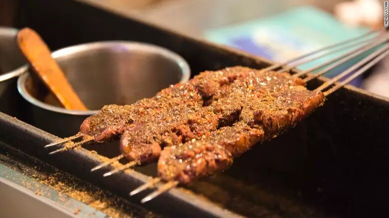 07. Kabob (chuan’er) – coated with chili [辣椒] and cumin [孜然] powder, it’s a highly addictive [使人上瘾的] midnight snack for Xi’an residents. It’s not unusual for locals to order 100 of them in one go.