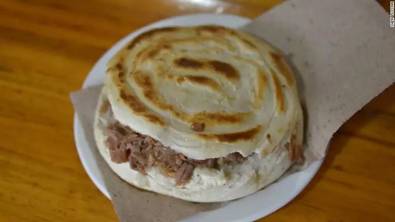 02. Xi’an meat burger (roujiamo) – Roujiamo is the city’s favorite burger. A delicious roujiamo is composed of [由……组成] two key elements – juicy shredded [切成碎片的] braised pork [炖猪肉] and a crispy baked bread.
