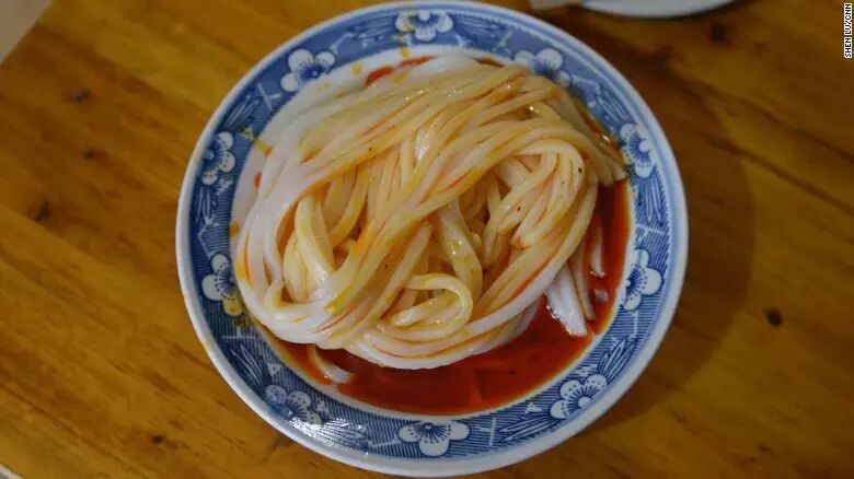 03. Cold noodles (liangpi) – Rice noodles are cooked, cooled and thinly sliced. The noodles are often served in a sauce made of chili oil [辣椒油], pepper powder, vinegar and diced garlic [切成丁的大蒜]. Then it’s garnished with [配有] bean sprouts [豆芽] and sliced cucumber [黄瓜].