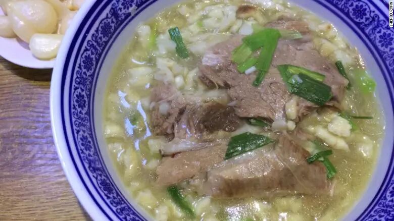 01. Flatbread in mutton soup (yangrou paomo) – Yangrou paomo is the most iconic [标志性的] dish in the Xi’an foodscape. The ritual [例行公事] before eating a paomo – tearing the bread into small pieces yourself before letting the chef turn it into a stew [炖的食物] – is as enjoyable as the dish itself.
