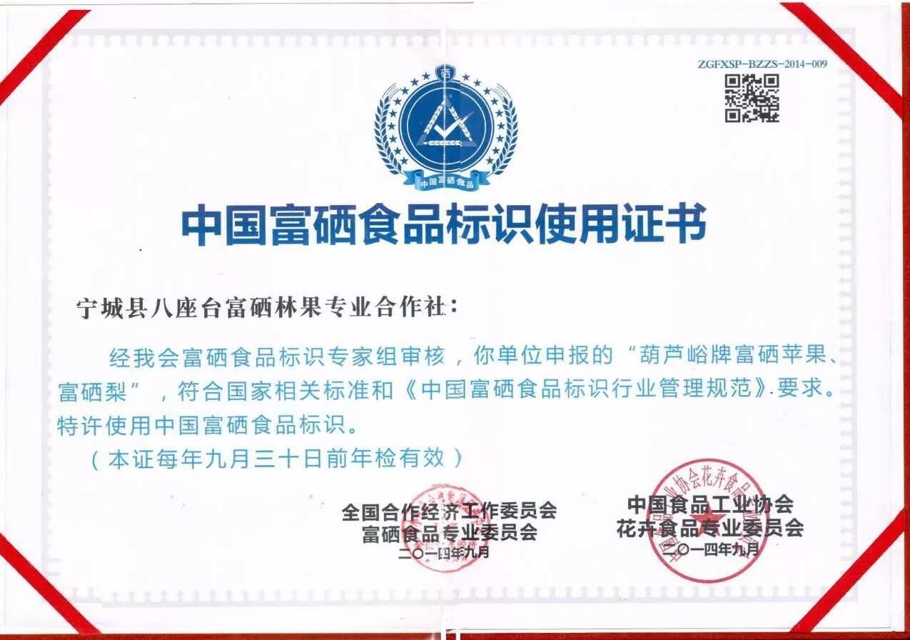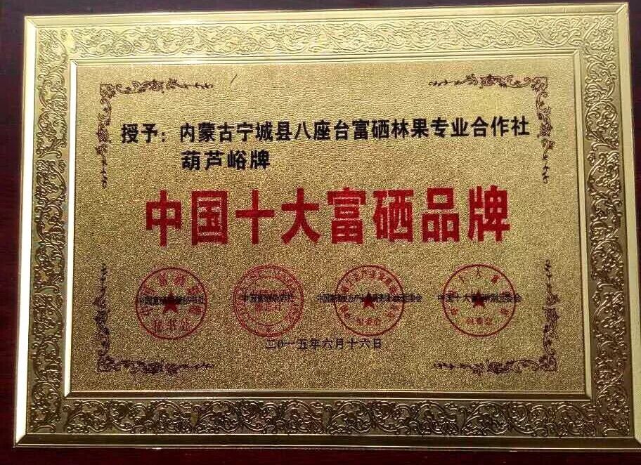 八座台合作社自2009年开始,历经五年的技术研究和探索,最终在我国北方打造出了“葫芦峪牌绿色富硒果品”目前,产品经国家权威机构检测符合国家绿色食品标准,2014年获得中国国际生态产业研究院花卉食品工业协会批准的“中国富硒食品”标志,该标志在内蒙古地区是唯一一家使用单位,产品完全符合国家“GB”标准,2014年又被“全国绿色农业安全食品生产办公室”审议批准为“全国绿色农业富硒果品生产示范基地”产品以进驻“全国优质农产品精品馆”。2015年被“全国绿色特产示范基地评审委员会”全国绿色农业特产示范基地。 顾客朋友们,为了您的健康,家庭的幸福,请您多了解一下有关富硒产品的知识,目前富硒市场鱼目混杂,认清富硒食品标识。送礼送健康“葫芦峪”富硒系列果品是您家庭食用,送亲访友的最佳选择,富硒食品将永远祝您幸福、健康、平安!![]()