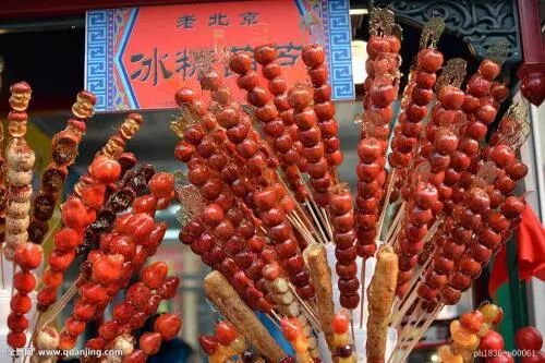 冰糖葫芦是中国传统美食,它是将野果用竹签串成串后蘸上麦芽糖稀,糖稀遇风迅速变硬。北方冬天常见的小吃,一般用山楂串成,糖稀被冻硬,吃起来又酸又甜,还很冰。