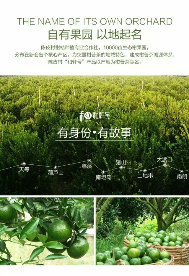 和轩号,作为新会陈皮村市场股份有限公司旗下子品牌,自诞生起,秉承匠心独运、精益求精的调性,陈皮之香,通达茶之妙,用心制茶,一心为柑茶正名。自拥果园,以求其鲜;地道溯源柑果,以保其真;仿生制作技艺,以留茶果自然生机。果香茶香于陈藏中,默然转化,互相渗透,皮自鲜而陈,茶自浓而醇,浑然同化,和然天成。匠心静候,酿的是家乡水土的味道。