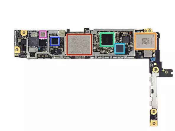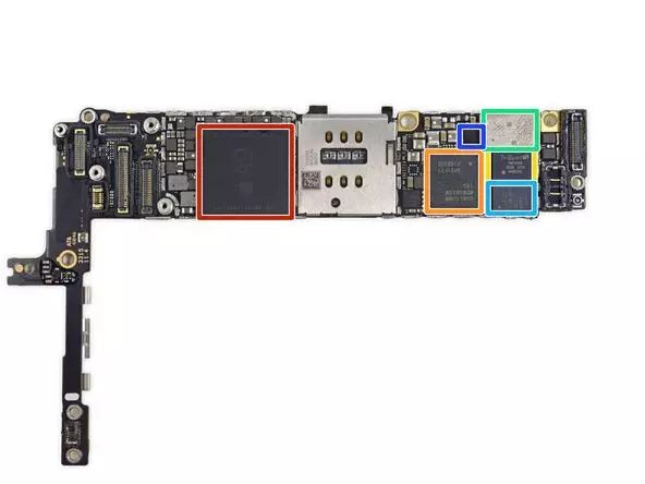 红色:Apple A9 APL1022 SoC + 海力士 2GB LPDDR4 内存(标记:H9HKNNNBTUMUMR-NLH)