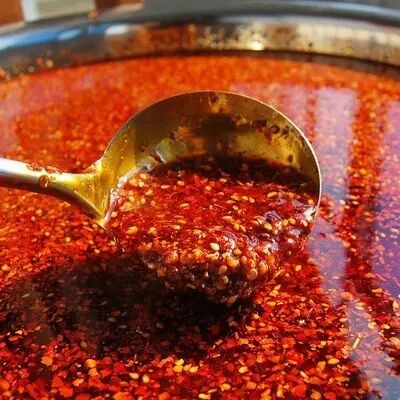 刚做成的油泼辣子还在咕嘟嘟地冒着小泡泡,随着泡泡渐渐消失,一碗油泼辣子归于宁静。这碗油泼辣子分为上下两层,上层为红润透明的辣子油,辣子面则沉在下面。经过高温油炸,辣椒的精华都融入了辣子油中。