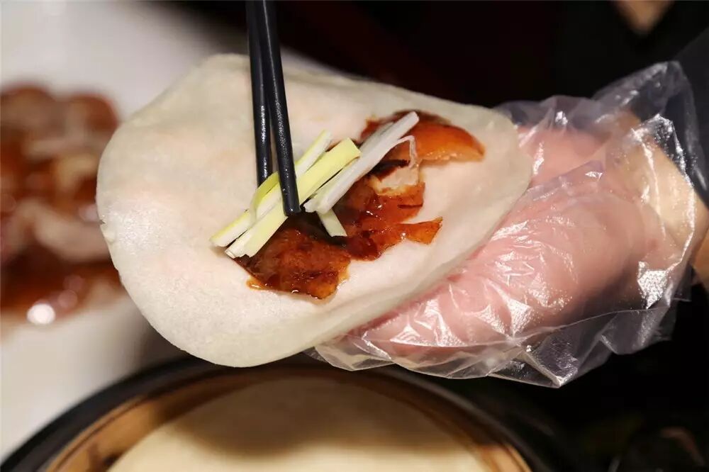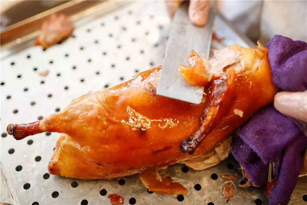 烤鸭有两种片法,一种是皮肉连片,一种是皮肉分开,而第二种更受年轻人欢迎。烤鸭配料的基本搭配有三种,一种是甜面酱加葱白,也可另配黄瓜条、萝卜条;一种是以葱、酱为主,另配蒜泥、黄瓜条;还有一种是以葱、酱为主,另配白糖,适合老人和小孩。