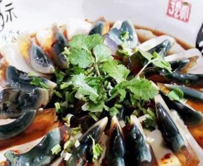 2、将用酱油、醋、盐、味精、辣椒油兑成的汁浇在皮蛋上,淋上香油即可。此菜为凉菜,建议调料配比为:酱油:辣椒油:醋;切皮蛋用线切方便又整齐。