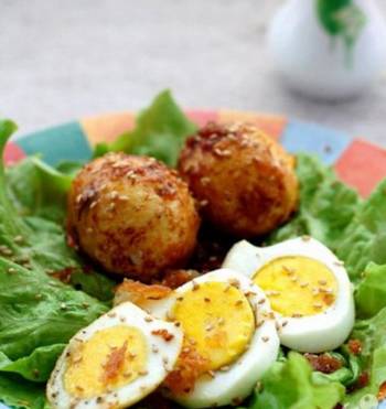 将鸡蛋煮熟,去皮,裹上一层面包渣,在淋一层蜂蜜,然后裹上一层肉松,在裹上一层面包渣,在油锅里炸一下,炸至金黄色,捞出--这就是美味的苏格兰煎蛋。