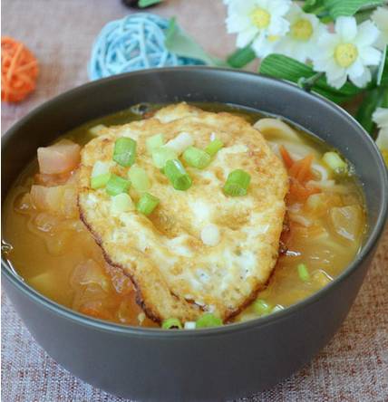 2、炒锅置旺火,下油烧至六成热,倒入蛋液煎熟,加入鲜汤(可用鸡粉加水),放盐调好味,放入蔬菜、番茄烧沸,撒葱花,出锅即成。可以用各种时鲜蔬菜,如小白菜、豌豆尖等;注意不同蔬菜下锅时间不同,以免煮太老。