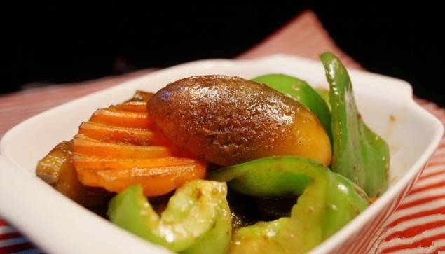 3、锅中下油2汤匙,下青椒炒香,下皮蛋、银鱼炒匀,下调味汁炒至汁干即可。不能吃辣的,可以用柿子椒;此菜冷热吃均可