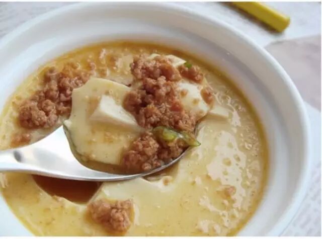 原料:豆腐500克、鸡蛋2个、盐、酱油、葱末各少许