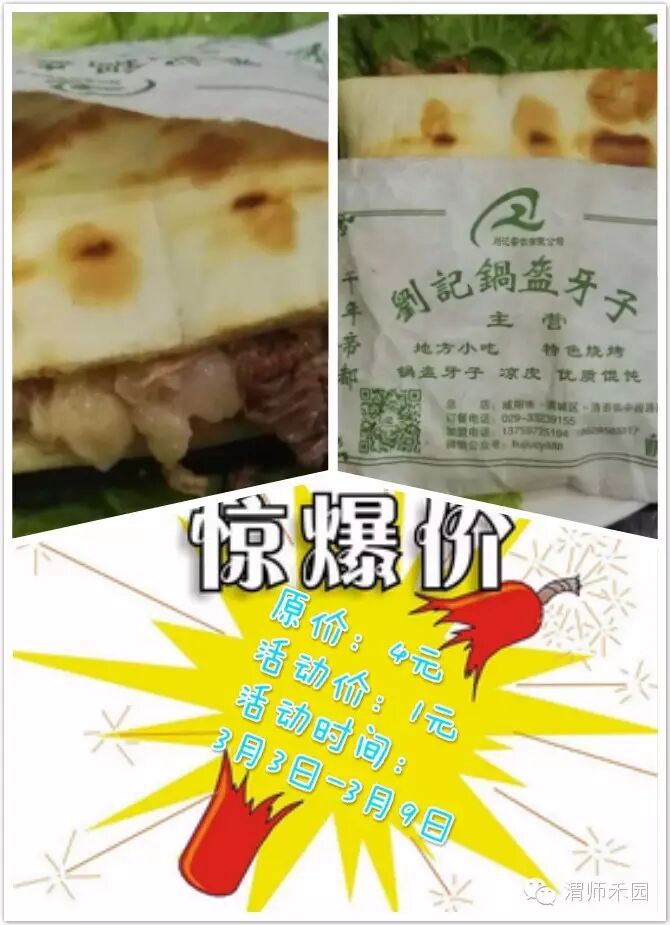 “好消息”“好消息”二餐三楼炒面混沌加盟中华各小吃(刘记锅盔牙子)好吃不贵,再次推出抽奖活动每天20名,原价4元,“现价只要1元,截止时间:2016-3-24,望大家积极参与,兑奖地点:二餐三楼师生之家收银台处。