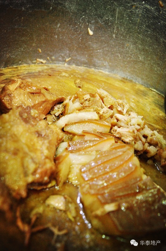 第五步挑选肥瘦适中的腊汁肉。腊汁肉要想入味,最好的办法就是放在加热的肉汤里长时间浸泡。![]()