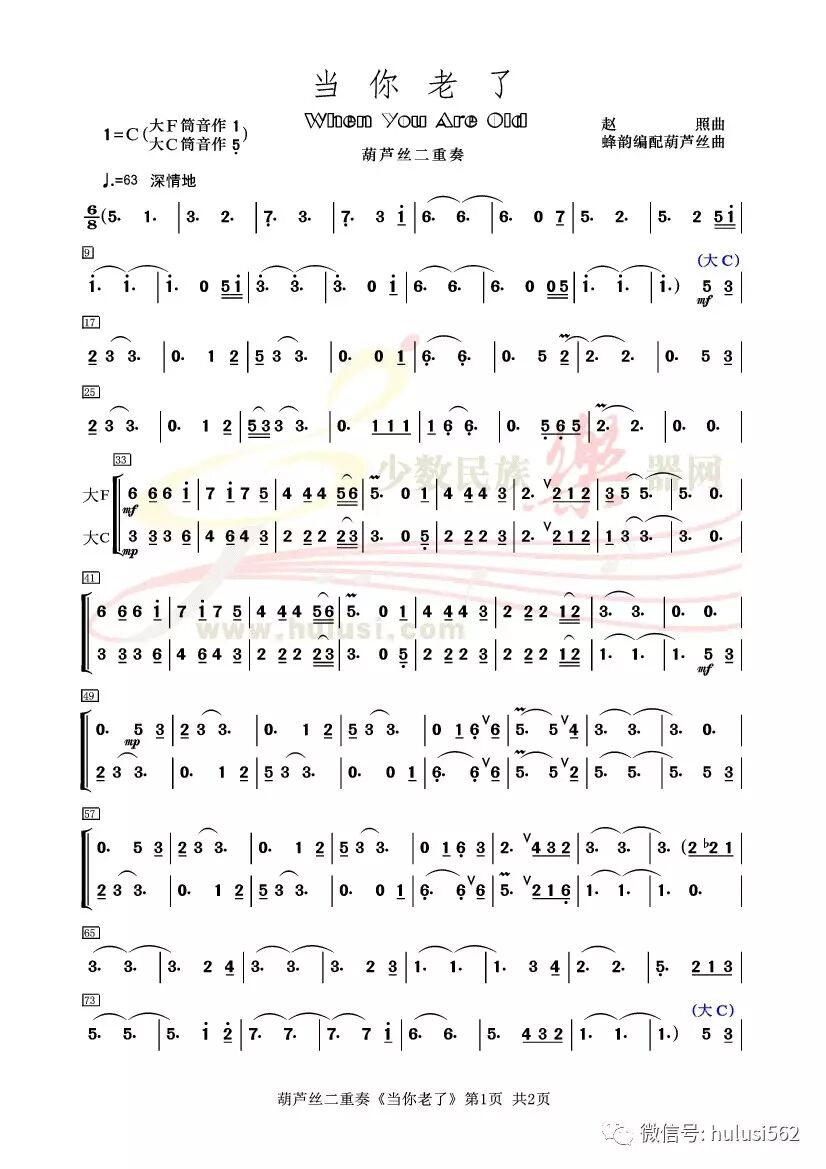 根据这首动人心弦的歌曲,我们编配了葫芦丝演奏曲《当你老了》分享给我们的朋友们,我们用自己的真情真心和对朋友的深爱,在这里说:“当你老了,依然有人深深地爱着你;当我老了,真心希望——这首歌是唱给你的,因为这是我们心里的歌……”。