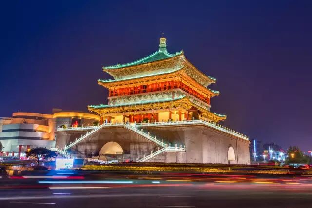 历经岁月沧桑,如今巨鼓早已不存,惟余鼓楼巍然耸立。钟楼上每天都有编钟表演,而展出的齐白石亲赠书画也颇为珍贵。夜景时恢弘大气,仿若梦回唐朝。