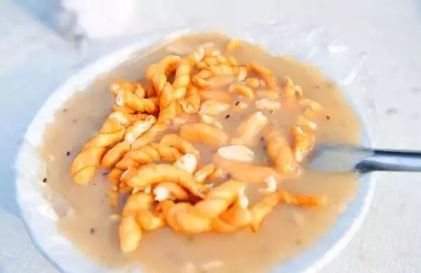 所谓油茶,即面粉、调料面加凉水搅成稠糊,徐徐溜入开水锅中搅拌,匀而没有疙瘩,再加入杏仁、芝麻、籼米,微火边烧边搅。再加入酱油、盐面、胡椒粉、味精,微火边烧边搅。完全要用搅功,搅得颜色发黄,油茶发稠,表面有裂纹痕迹才止。