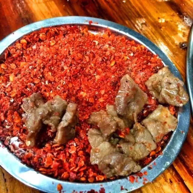 牛肉炒的干干的,把牛肉本身的汤汁锁在了牛肉里。牛肉比较辣,带点丝丝的回甜,如果实在馋,还可以打包回家当零嘴吃。
