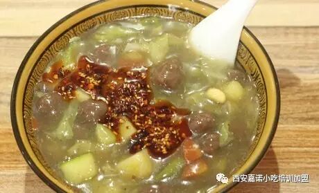 汤里有浑圆的牛肉丸子,切成块状的土豆、莲花白、胡萝卜、菜花、芹菜等。先用牛羊骨熬汤,下牛肉丸,烩菜,最后勾芡而成。说起容易,但是要做到菜不煮烂,适合可口可是有功夫的。