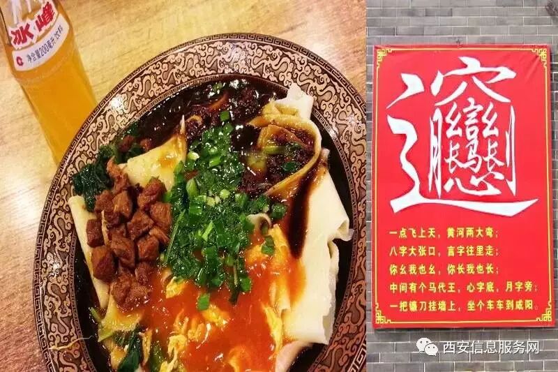 biang字,字型复杂,在各种字典中不曾收录,该字的普通话轻声或二声就是正确的陕西方言发音。在平时的路边摊小饭馆,更多的则是三秦套餐:凉皮、肉夹馍和冰峰汽水。