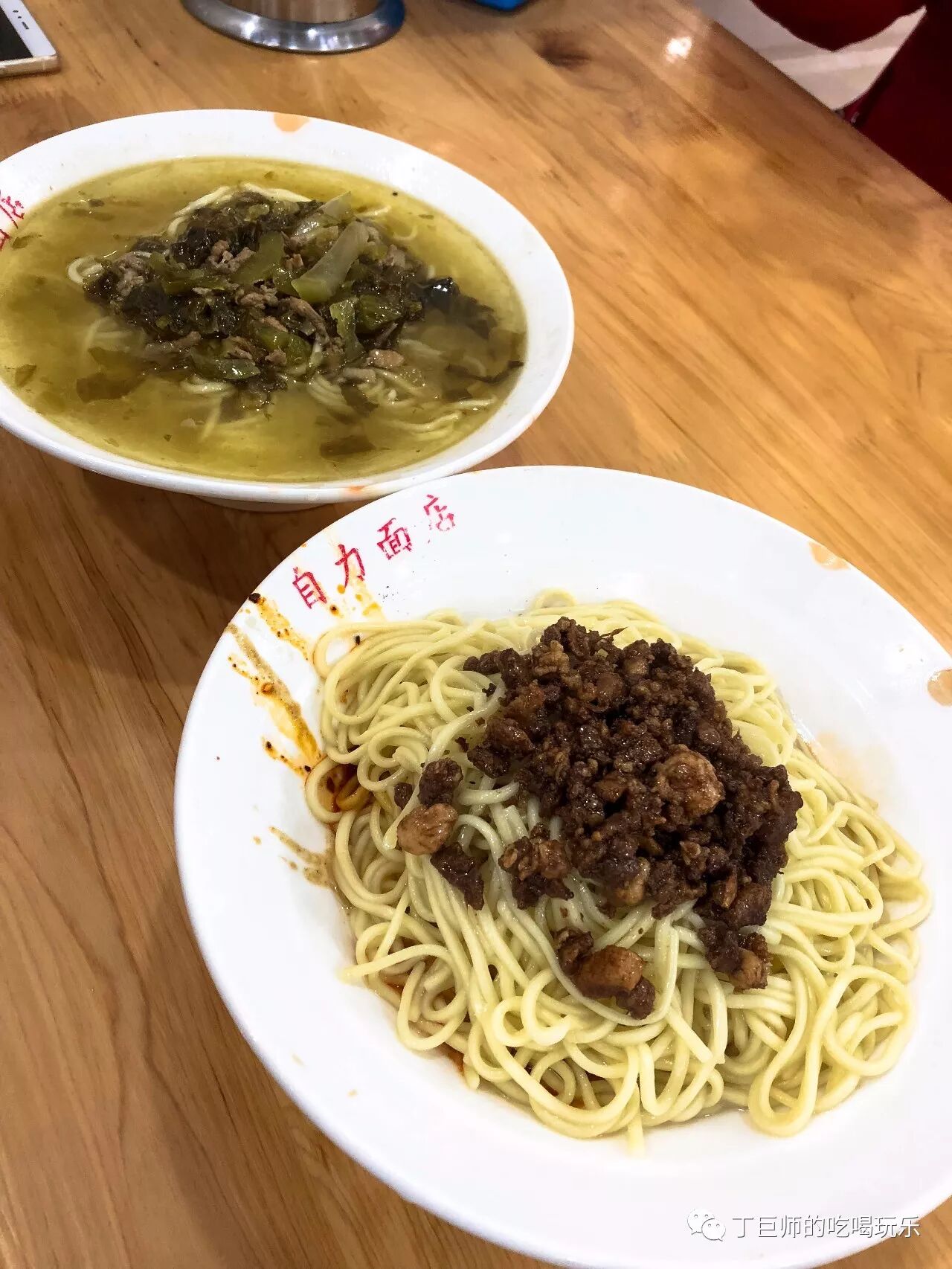 不自量力的点了二两面,结果老板太实诚,一大碗给你端上来。两位美少女点的酸菜面,巨师本人当然要尝尝招牌“素椒面”啦。酱在上料在下,拌匀再吃,面条筋道又带着蜀地特有的麻辣,哎呀妈,děi劲。